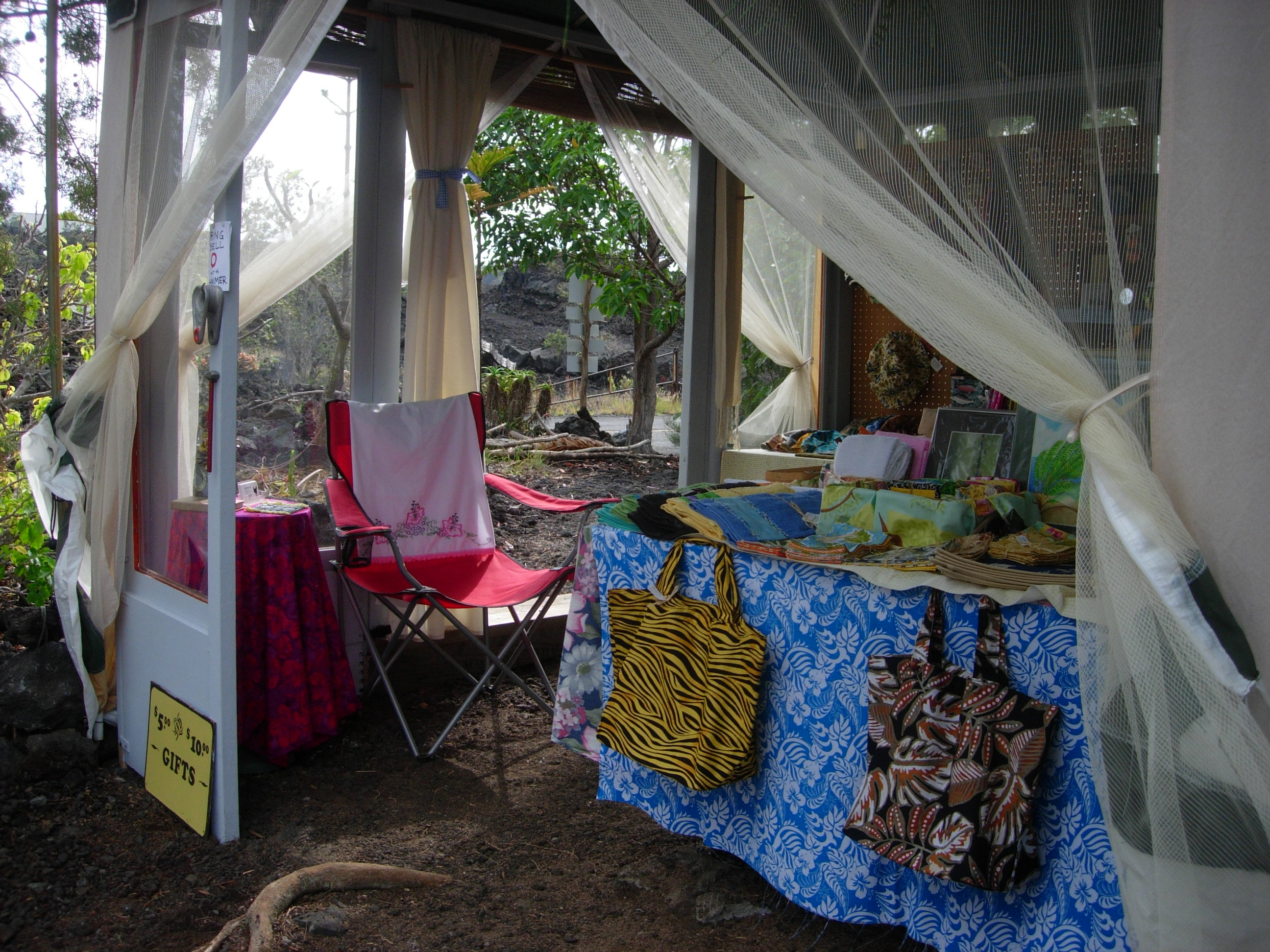 The gallery is open rain or shine. I mean that sincerely. Unless it is raining sideways. I’m very happy with my new round side table, so dainty with a flowered cover. It’s just right for a guest book and business cards. And, a coaster waiting for a cup of hot tea, or maybe iced tea, depending on the day. Hope to see you this weekend! Aloha.