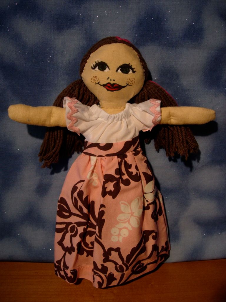 DSCN7393 Published March 12, 2014 at 1846 × 2462 in DSCN7393 Tie back dress in pink with rick-rack accents. Made from repurposed fabric.