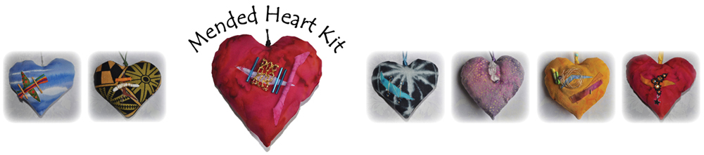 The idea is to mend the cut opening. I “bridge” the span of the cut with a primary element and supplement with added elements. After the heart is stuffed and lined I lay out my chosen mending elements and consider how it looks as a composition. It’s a thoughtful process. How it feels to me is important. When I’m happy with how it looks and feels I begin to attach the mending elements. Even at this point I may add to or subtract from what I have chosen. There are at least as many ways to mend a heart as there are persons doing the mending!
